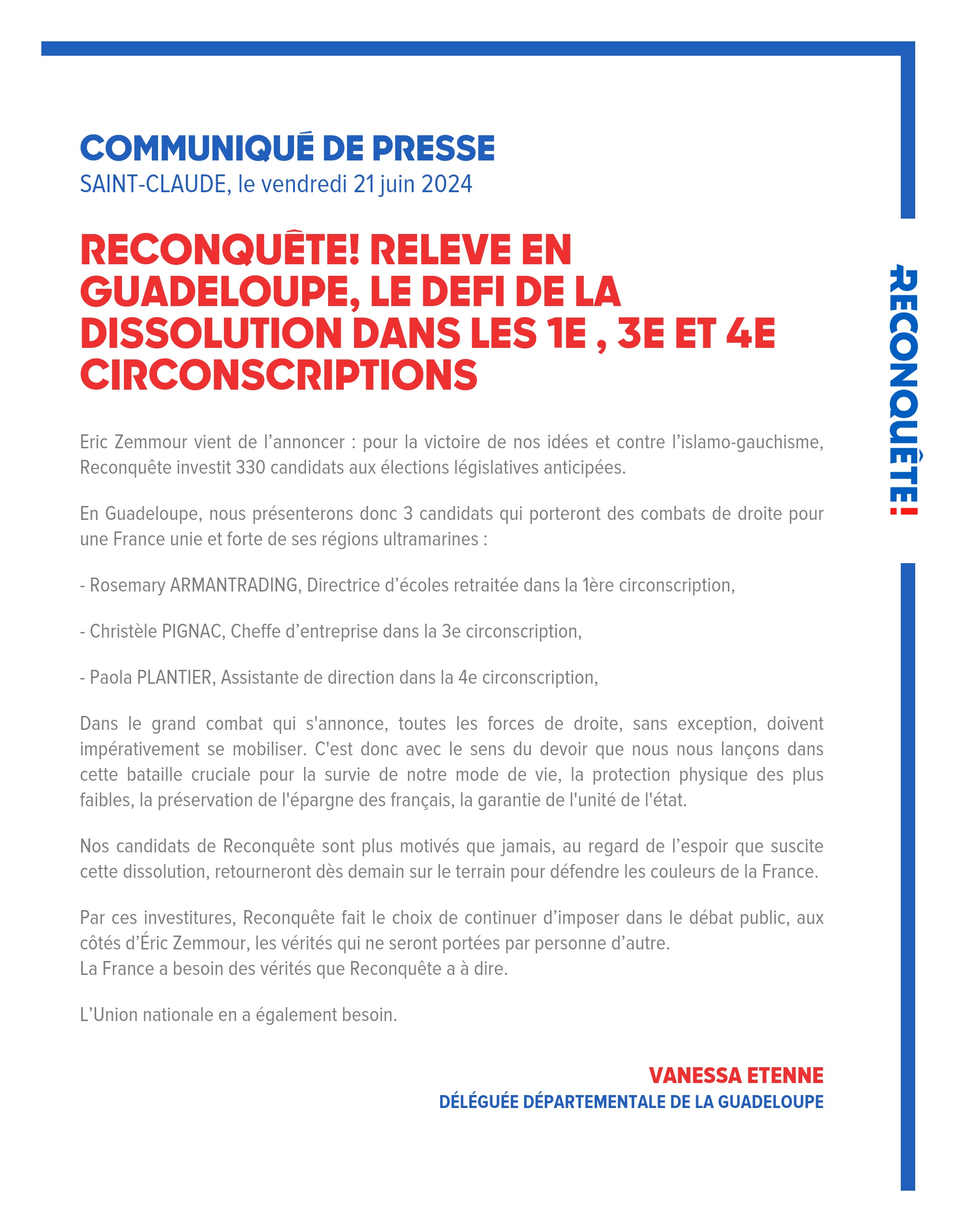 RECONQUÊTE! RELEVE EN GUADELOUPE, LE DEFI DE LA DISSOLUTION DANS LES 1e , 3e et 4e CIRCONSCRIPTIONS